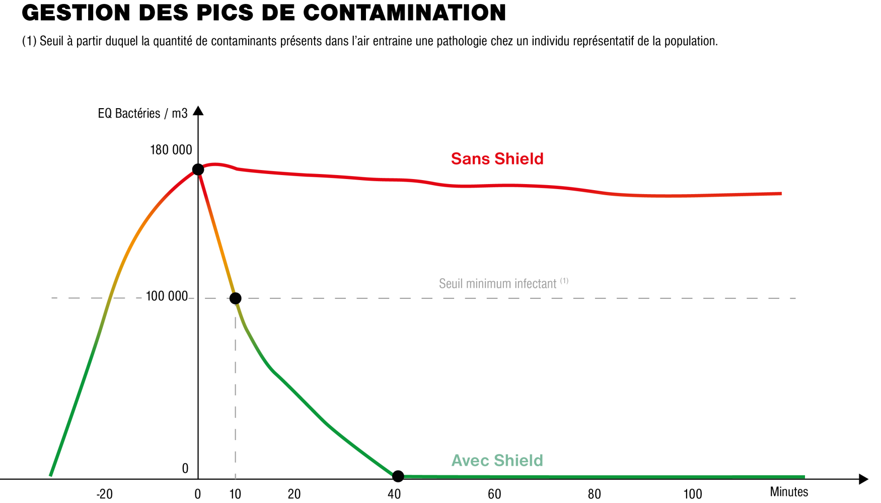 Protect the system by fighting contaminants: viruses, bacteria and molds. Tests performed by an independent laboratory according to the NFB44-200 normative procedure, examining the performance of the Shield® against the constant generation of contaminants. The results show destruction rates of micro-organisms (alone and in mixtures representative of the atmosphere) ranging from 94 to